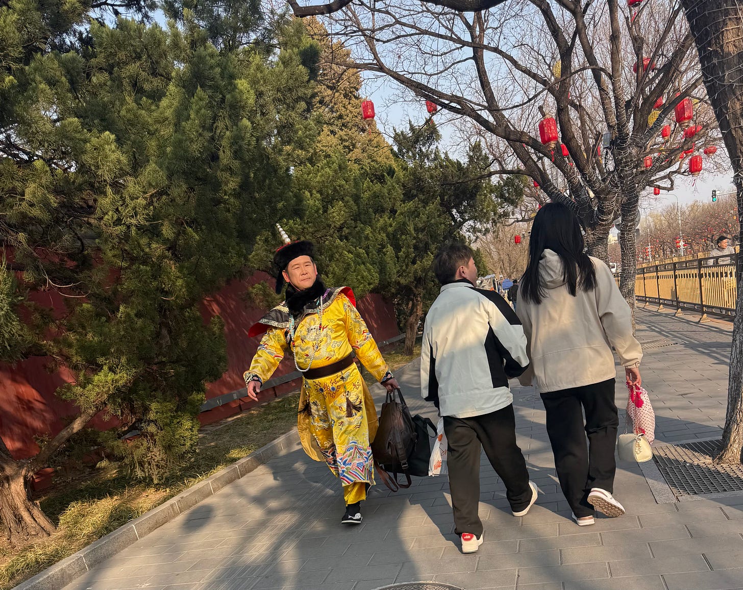 When I left 14 years ago, the fashion compass of Chinese youth was firmly pointed toward Paris or New York. Today, they are defining their own aesthetic within a five-thousand-year lineage. This return of “cultural confidence” is driven both by a systematic official revival of tradition and the precision of social media algorithms in reshaping national identity. I couldn’t help but smile outside the Gate of Divine Prowess (Shenwumen) when I saw a young man dressed as a Qing Dynasty emperor, rushing along with a modern backpack—a time-traveling mashup that felt like a touch of Mr. Bean-style irony.