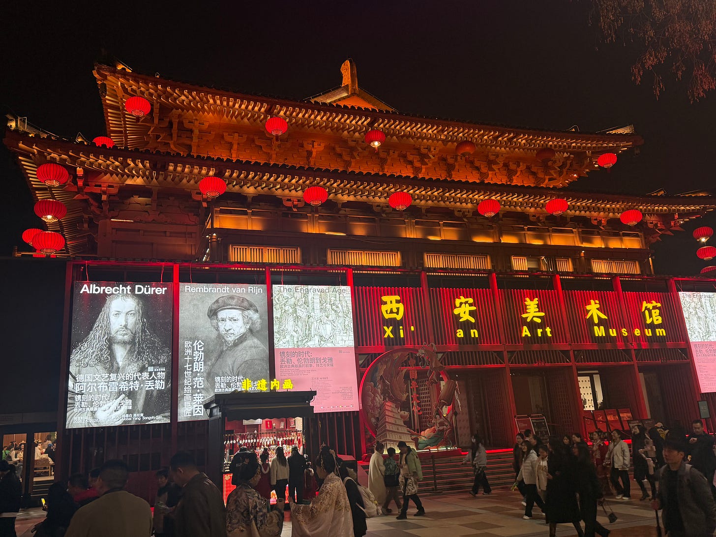 As night falls, this two-kilometer pedestrian axis transforms into a living performance of the Rainbow Skirt and Feathered Dress Dance. Towering sculptures of the Zhenguan era intermingle with the nimble “Tumbler Girl,” while tourists compete in poetry recitals with an actor playing the poet Li Bai. Were it not for the Tang-style Starbucks, the Rembrandt posters on the walls of the Xi’an Art Museum, or the flickering phone screens on livestreaming tripods, I might have suffered a total hallucination of time travel.